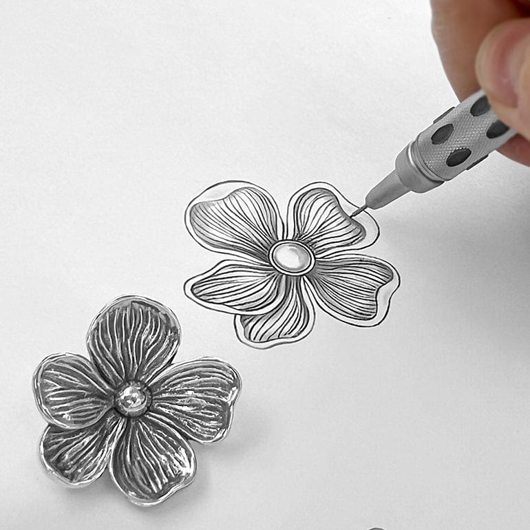 Loved for its realistic sculpting, the “windflower” ornament begins with Catherine’s hand sketch and our artisans capture her renditions of real flowers in metal form – every detail of the petals is exquisitely rendered.